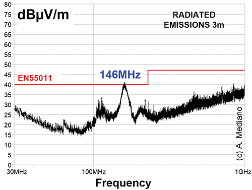 電流二極管測量的振鈴消失了,在半消聲室進行了一次新的測試,得到了圖4中固定系統(tǒng)的黑色曲線。